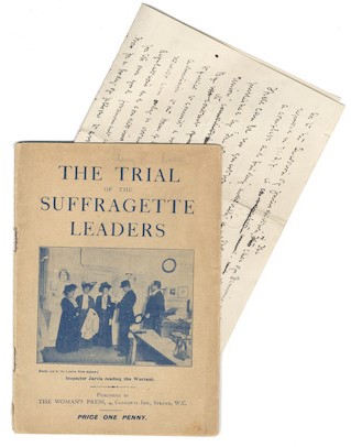 First edition; 8vo; original illustrated printed wrappers with photographic illustration depicting "Inspector Jarvis reading the Warrant"; 48pp; portrait of Emmeline Pankhurst. Together with a sheet of draft notes by the magistrate, Curtis Bennett, possibly for the summing up in the trial, with deletions and amendments, 2 pages, on embossed 'Police Court Bow Street' paper. A scarce pamphlet containing a full account of the 1908 trial of Emmeline and Christabel Pankhurst, and Flora Drummond, which took place on October 14th to 24th. It includes statements from those involved (beginning with a long speech by Christabel Pankhurst), the evidence of the witnesses, Christabel's cross-examination of David Lloyd George, and the final summing up and sentencing by the Magistrate, Curtis Bennett. His notes indicate he was in no doubt that the handbill published by the Women's Social and Political Union had served to incite large crowds "to assemble in public to commit a "wrongful and illegal act" by 'rushing' the House of Commons, thus causing breach of the peace. Very good some soiling, chip to edge of lower cover and foot of spine.