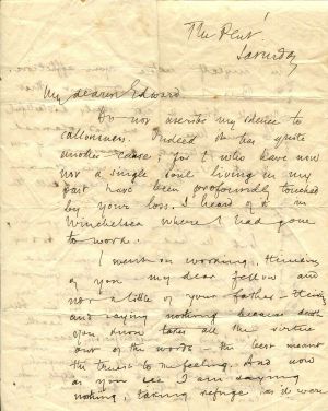 Autograph signed letter; two pages; 4to. To Edward [Garnett] -´My dearest Edward´. Conrad writes to his friend following the death of Garnet's mother, ´Do not ascribe my silence to callousness. Indeed it has quite another cause; for I who have now not a single soul living in my past have been profoundly touched by your loss. I heard of it in Winchelsea where I had gone to work. I went on working, thinking of you my dear fellow and nor a little of your father - thinking and saying nothing because death, you know, takes all the virtue out of the words - the best meant the truest to the feeling. And now as you see I am saying nothing, taking refuge as it were in myself before your affliction´ and further writing ´But I hope and trust that you´ll find it not utterly distasteful to come here as we had planned in the fortunate ignorance of our hearts. Verily we who remain are most tenderly treated till the very moment of execution´. Conrad adds that he had heard a little news from Ford Madox Ford about Garnett and his family, although asks for more, remarking ´For your poor Father and your sister Olive my concern is the greatest - for him because of the great shock; and of her health I´ve heard an unsatisfactory account from Ford´, and concludes by expressing his affectionate regards to Garnett´s wife, sending his love to them all, and again extending an invitation, ´And come if you can, if you care to come´. Edward Garnett (1868-1937) English writer and critic was a reader for Unwins the publishers in 1894 when he met Conrad for the first time having been impressed by Almayer's Folly, the two became instantly friends. Garnet was later to introduce Conrad to Ford Madox Ford. Very good.