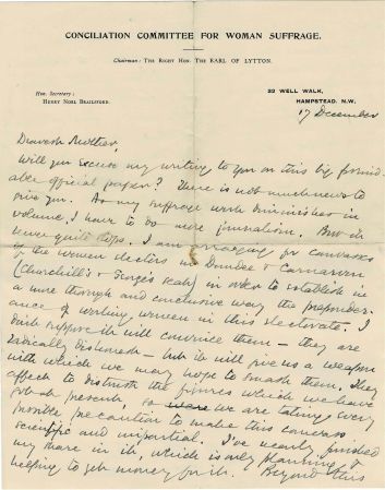 Autograph Letter signed from Henry Noel Brailsford to his mother on Conciliation Committee For Woman Suffrage headed paper. Brailsford was a journalist, political activist and husband of the militant suffragette Jane Brailsford. He was also Secretary and founding member of the Conciliation Committee For Woman Suffrage. The Committee was an all-party group of MPs formed chaired by Lord Lytton, to draft moderate bills granting limited votes to some propertied women, aiming for a compromise that would satisfy both moderate suffragists and anti-suffragists. Three such "Conciliation Bills" were introduced (1910, 1911, 1912) but failed, partly due to government opposition and fears among some MPs that enfranchising women would hurt their parties, with militant suffragettes also rejecting the limited scope. The letter dated 17 December 1910 refers to the event subsequently called "Black Friday" on 18 November 1910 when 300 women marched on Parliament and many were arrested and allegedly sexualy assaulted by the Police and male bystanders. In the letter Brailsford tells his mother "The evidence is simply sickening. The police were worse than usual. They indulged in many instances in the foulest sort of indecent assault". Brailsford was one of the key figures in instigating a public inquiry into Black Friday and he talks of this possibility. A public inquiry was rejected by Winston Churchil and as a result Brailsford collected 135 statements from demonstrators, nearly all of which described acts of violence against the women; 29 of the statements also included details of violence that included indecency. The memorandum they published summarised their findings:The action of which the most frequent complaint is made is variously described as twisting round, pinching, screwing, nipping, or wringing the breast. This was often done in the most public way so as to inflict the utmost humiliation. Not only was it an offence against decency; it caused in many cases intense pain ... The language used by some of the police while performing this action proves that it was consciously sensual. In the letter Brailsford mentions his efforts to arrange for women canvassers in the constituencies of Lloyd George and Churchill and his wife's campaigning in Torquay against an anti - suffragist Liberal MP. a